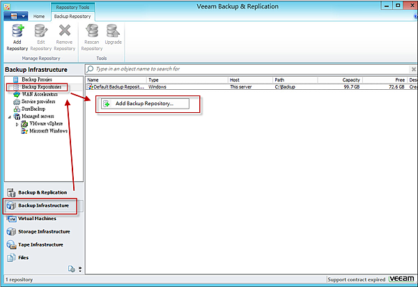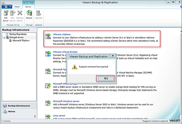 1.啟動Veeam,如下圖1年支援保固已到期=>確定=>點擊VMware vSphere
