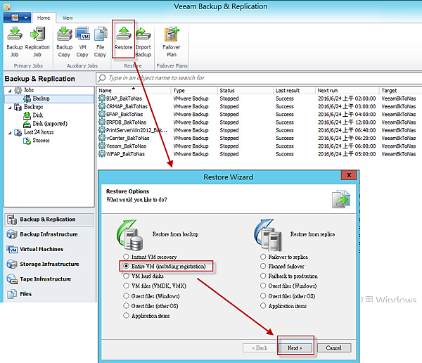 1.點擊Restore=>Entire VM (including registration)=>Next